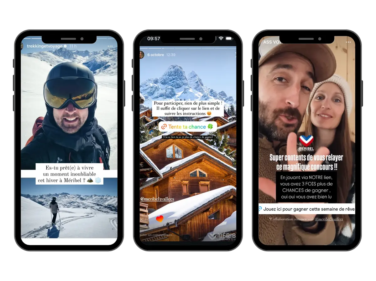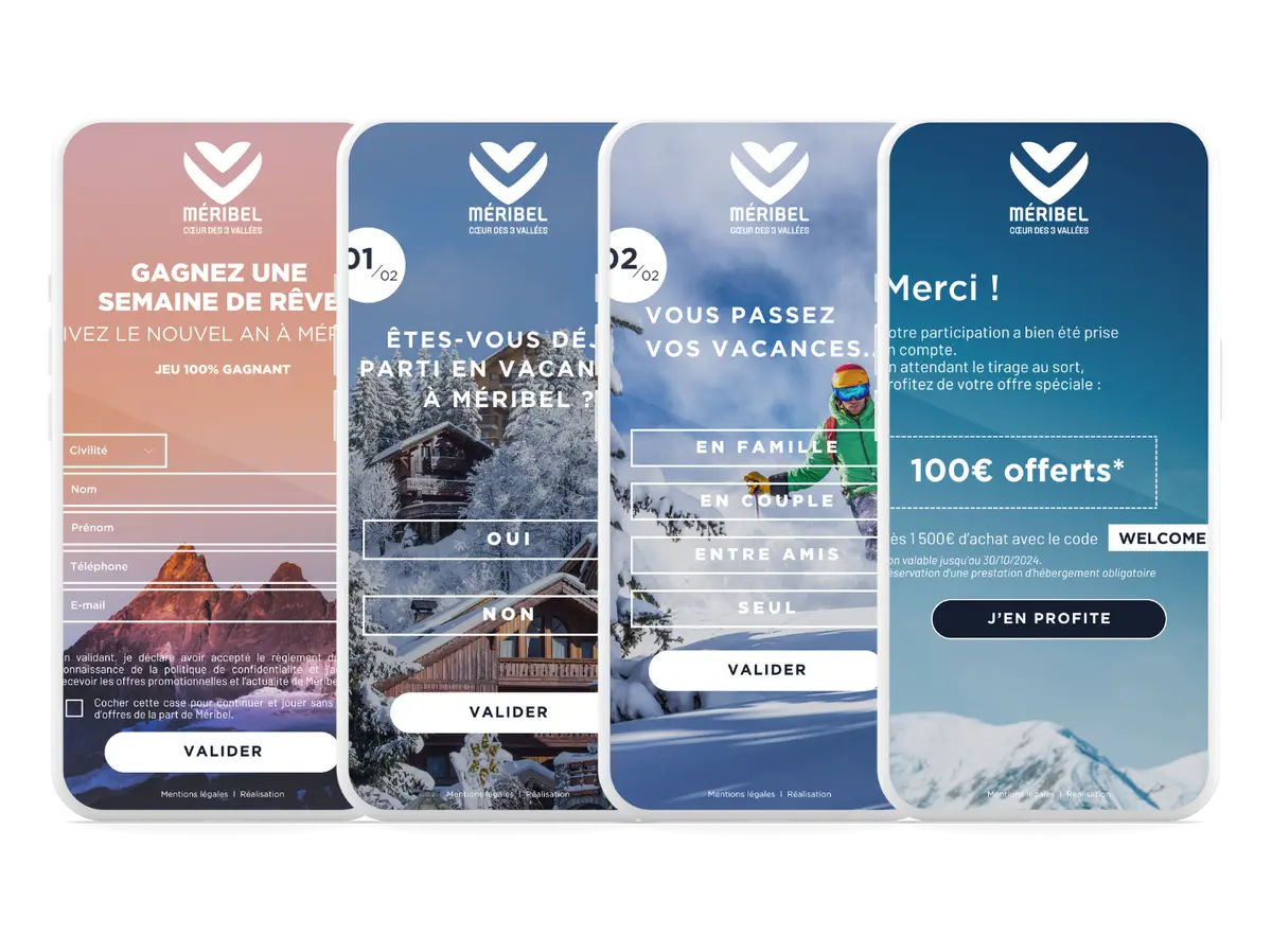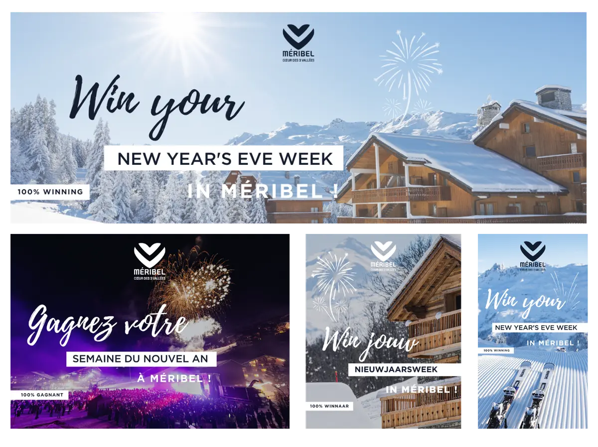 La station de Méribel souhaitait mettre en place un jeu concours digital ambitieux pour valoriser son offre hivernale, recruter de nouveaux leads qualifiés et renforcer sa notoriété auprès de publics ciblés. L’objectif : concevoir une opération multilingue (FR, UK, NL), attractive pour les familles, les couples et les groupes d’amis, tout en s’appuyant sur la puissance de l’influence pour amplifier sa portée.